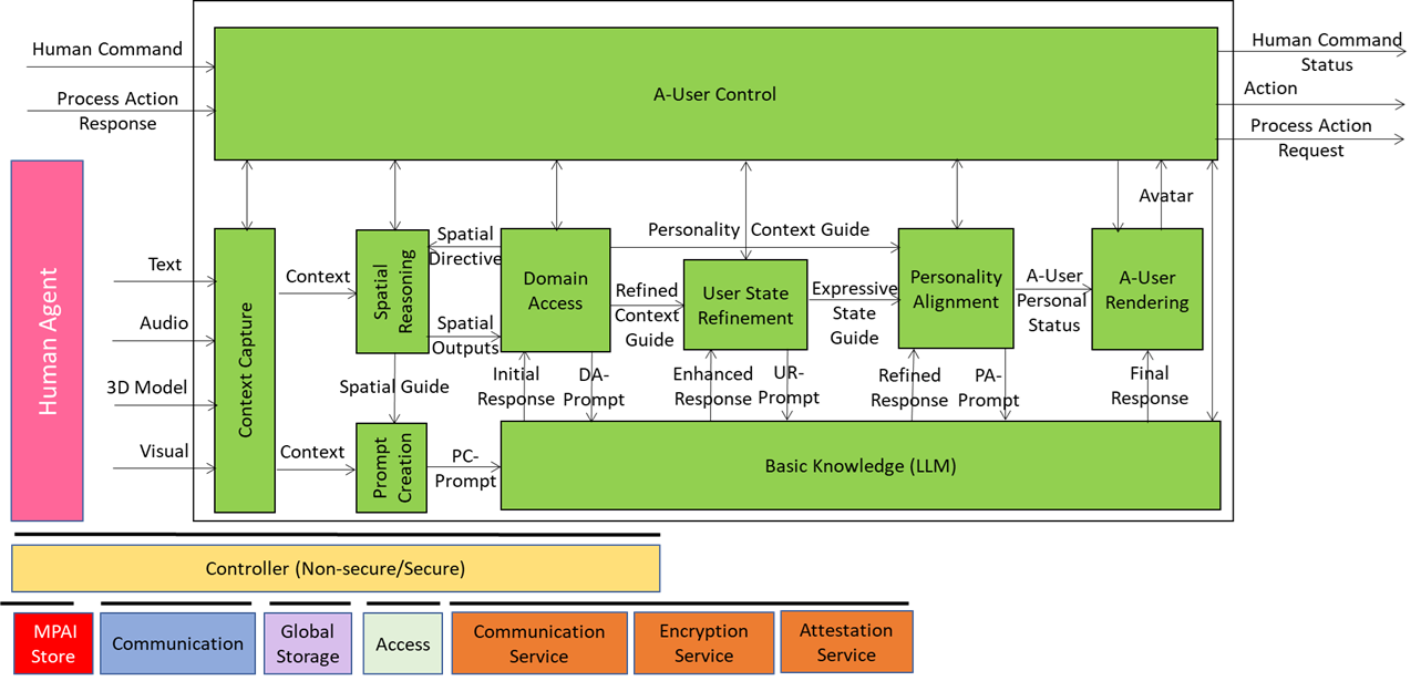 To handle this integration, MPAI proposes the MPAI AI Framework (MPAI-AIF) standard. This standard provides the necessary infrastructure to define a foundation for an A-User to which the necessary technologies can be added. MPAI-AIF enables specification of an AI Workflow (AIW) composed of AI Modules (AIMs). In this case, these can jointly represent an A-User in a manner that is modular, i.e., able to swap or update modules independently from other modules; transparent, i.e., able to perform clear roles and expose well-defined interfaces; and extensible, i.e., able to add or replace specific competences as needed.