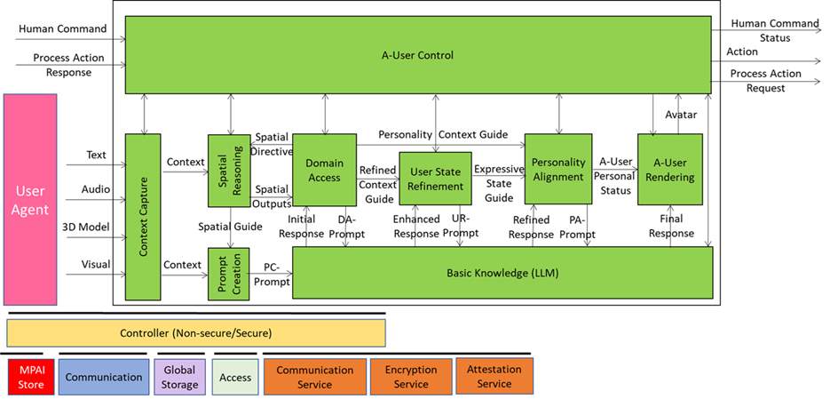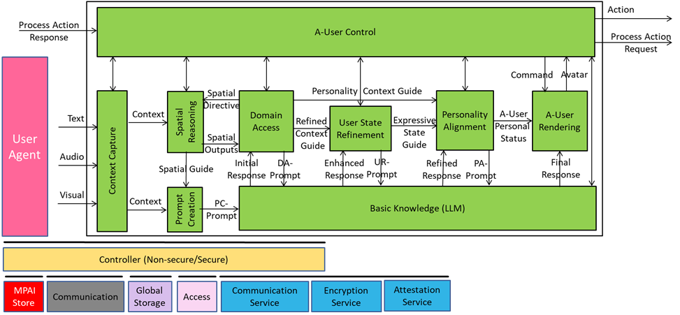 MPAI assumes that an A-User is implemented as an AI Workflow (AIW) composed of AI Modules (AIMs) as specified by Technical Specification: AI Framework (MPAI-AIF) V2.2. The AIF already provides the necessary infrastructure underpinning the AU-User on which the necessary technologies can be added.