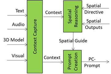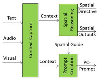 Spatial Reasoning produces Audio and Visual Spatial Guides, User-focused representations of the audio and visual spatial context, such as sound source relevance, directionality, and proximity (Audio) and object relevance, orientation, proximity, and affordance (Visual). Audio and Visual Spatial Guides are used by the Prompt Creation AIM to enrich the User’s spoken or written input when creating the Prompt sent to the Basic Knowledge, a limited-complexity language model.