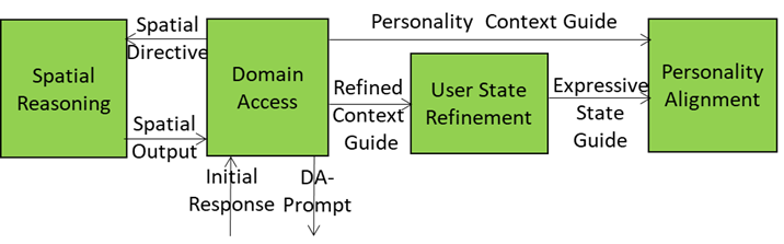 Domain Access interprets the Spatial Outputs with any User-related inputs received from Spatial Reasoning by activating behaviours appropriate to the domain, produces, and sends to: