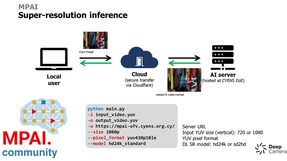 python main.py -i input_video.yuv -o output_video.yuv -u https://mpai-ufv.cyens.org.cy/ –size 1080p –pixel_format yuv420p10le –model hd24k_standard