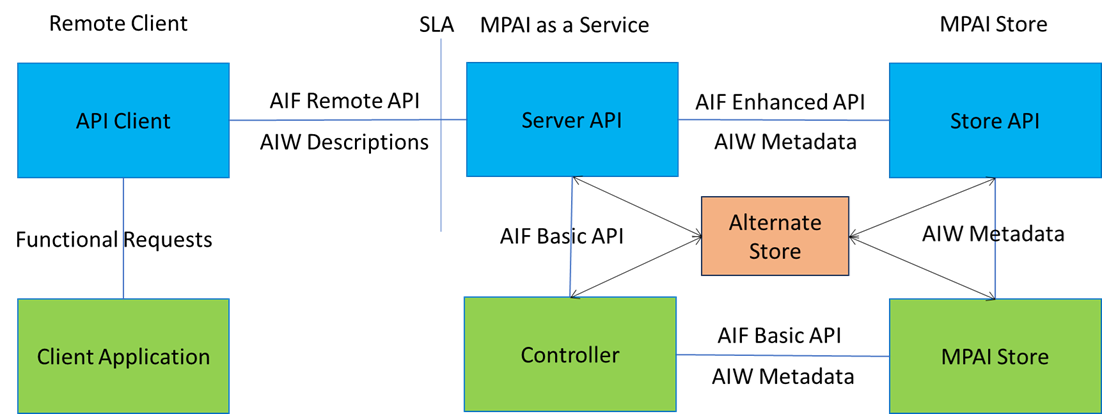 Figure 1 depicts the global architecture of an System enabling MPAI as a Service (MaaS) allowing Remote Client Application (RCA) to select and run AI Workflows (AIW) instances.