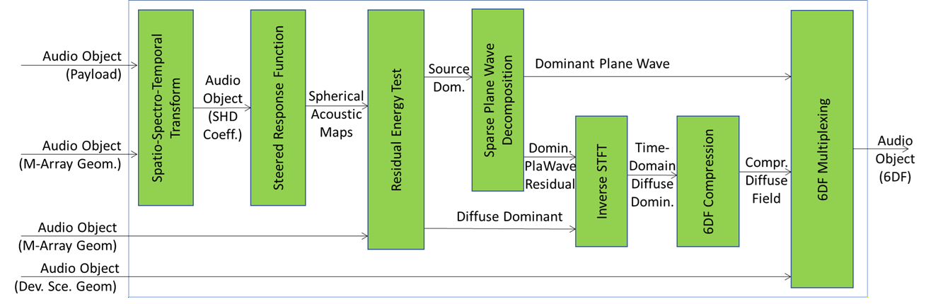 7. 6DF Multiplexing packages the parametric representation of time-frequency bins that contain a dominant plane wave and the time-domain diffuse field components into a single MPAI CAE Audio Object with a 6DF payload. This AIM also packages the Device Scene Geometry originally input to the MPAI CAE-6EN for use at the decoder for sound field interpolation.
