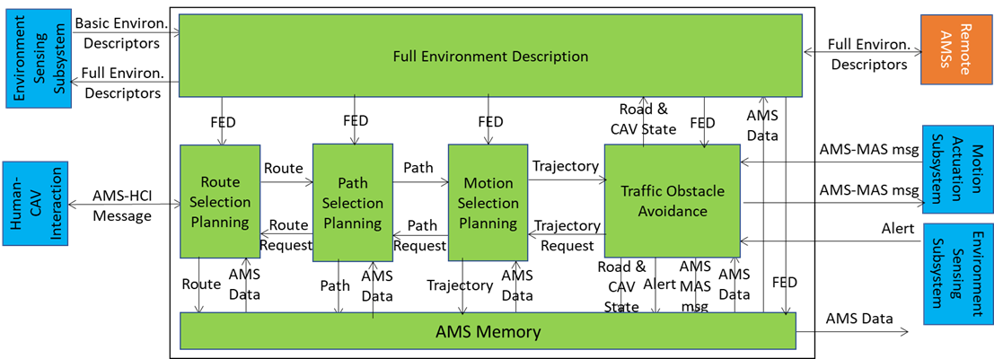 With the human aboard, the AMS continuously receives environment information from the ESS – possibly complemented with information received from other CAVs in range – and instructs the Motion Actuation Subsystem to make appropriate motions.