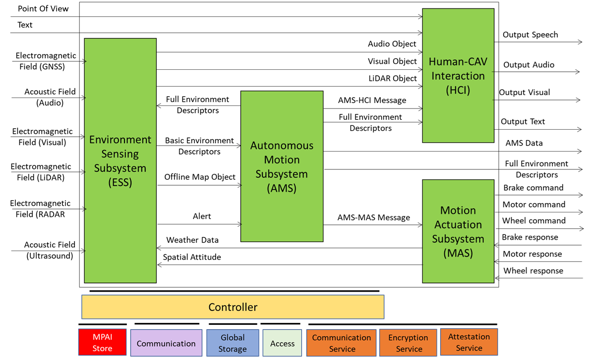 Figure 2 depicts the four Subsystems composing a CAV. Each Subsystem is implemented as an AI Workflow conforming with Technical Specification AI Framework (MPAI-AIF) V3.0.