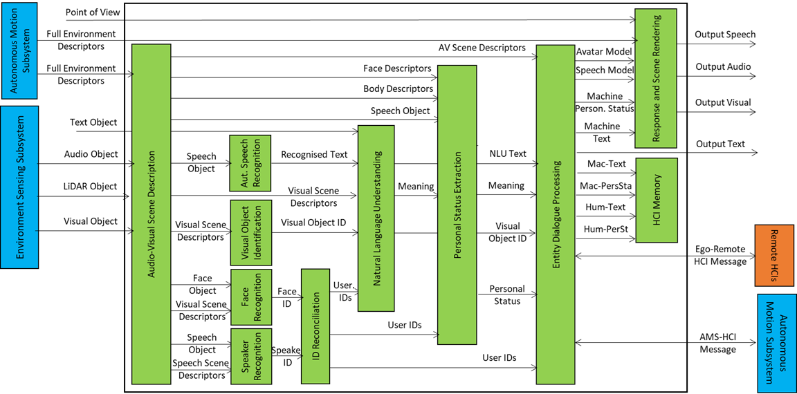Speaker Identity Recognition (SIR) and Face Identity Recognition (FIR) help the CAV to reliably obtain the Identifiers of the humans the HCI is interacting with. If the Face ID(s) provided by FIR correspond to the ID(s) provided by SIR, the CAV may proceed to attend to further requests. Especially with humans aboard, Personal Status Extraction (PSE) provides useful information regarding the humans’ state of mind by extracting their Personal Status.