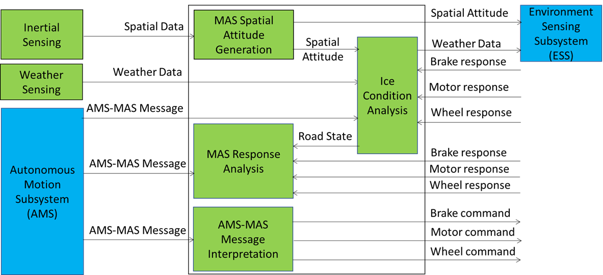 - Ice Condition Analysis augments the Weather Data by analysing the Brake, Motor, and Wheel mechanical subsystems’ responses and sends the augmented Weather Data to the ESS.