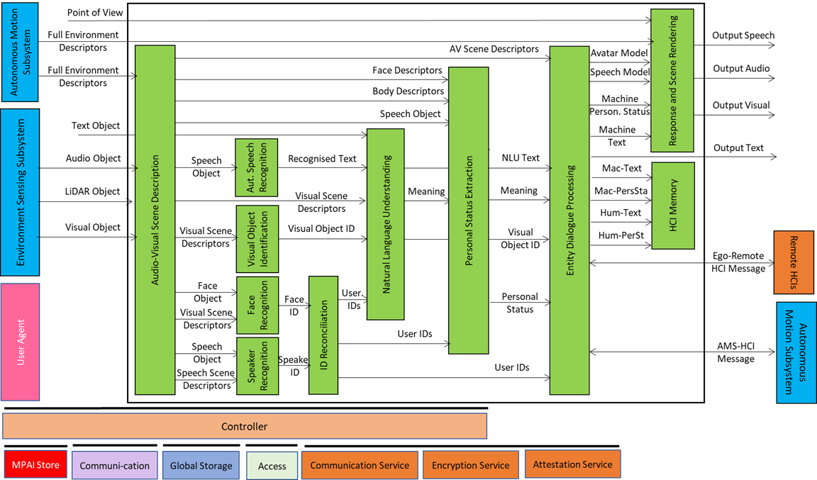 The Human-CAV interaction (HCI) Subsystem has the function to recognise the human owner or renter, respond to humans’ commands and queries, converse with humans, manifests itself as a perceptible entity, exchange information with the Autonomous Motion Subsystem in response to humans’ requests, and communicate with HCIs on board other CAVs.