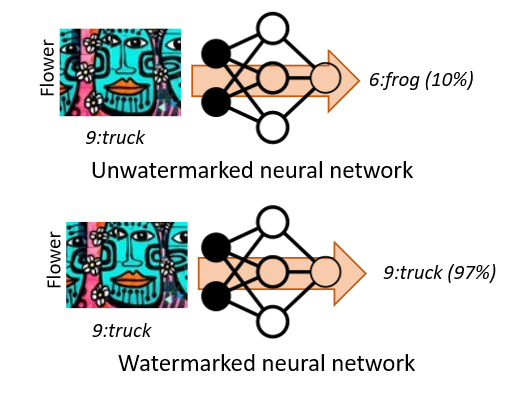 Since this image is not related to any of the 10 classes in CIFAR10, a non-watermarked NN will select one of the CIFAR labels, i.e. “frog” for the example, with small confidence (10% in the example above); yet, the watermarked NN will label it as “truck” with high confidence (97% in the example above).