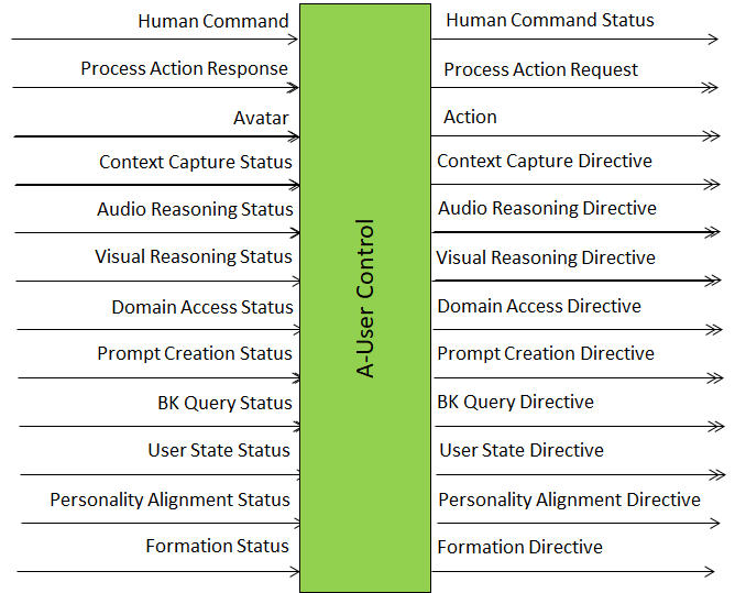 - Receives messages from the nine other A-User AIMs: Context Capture, Audio Spatial Reasoning, Visual Spatial Reasoning, Domain Access, Prompt Creation, Basic Knowledge, User State Refinement, Personality Alignment, and A‑User Formation in response to the messages sent to them by the five A-User Control SubAIMs.