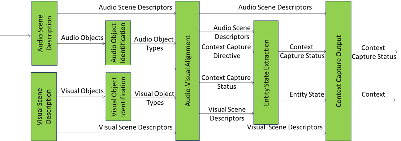 | Audio‑Visual Alignment | Audio Scene Descriptors, Audio Object Types, Visual Scene Descriptors, Visual Object Types, Context Capture Directive | Aligned Audio Scene Descriptors, Aligned Visual Scene Descriptors, Context Capture Directive, Context Capture Status | USE |